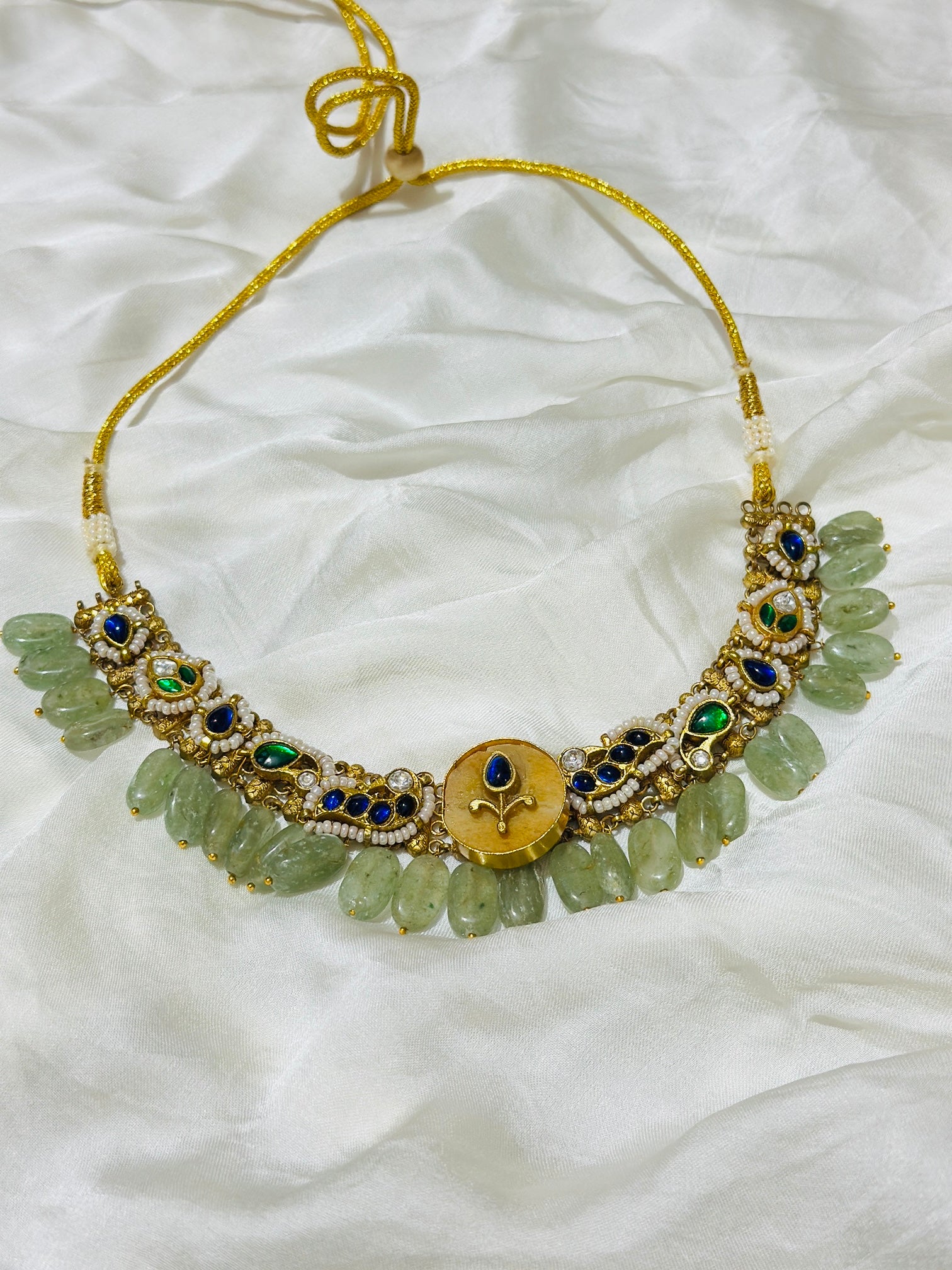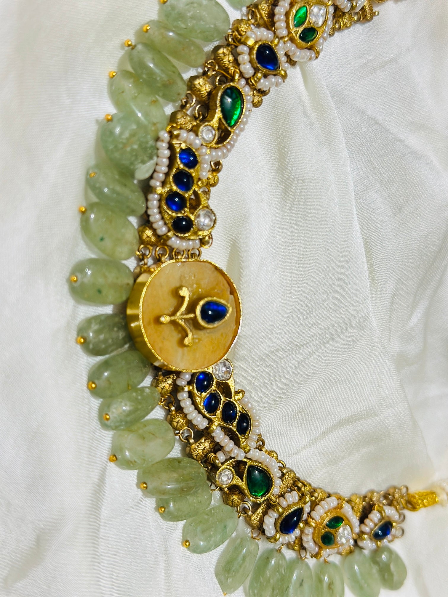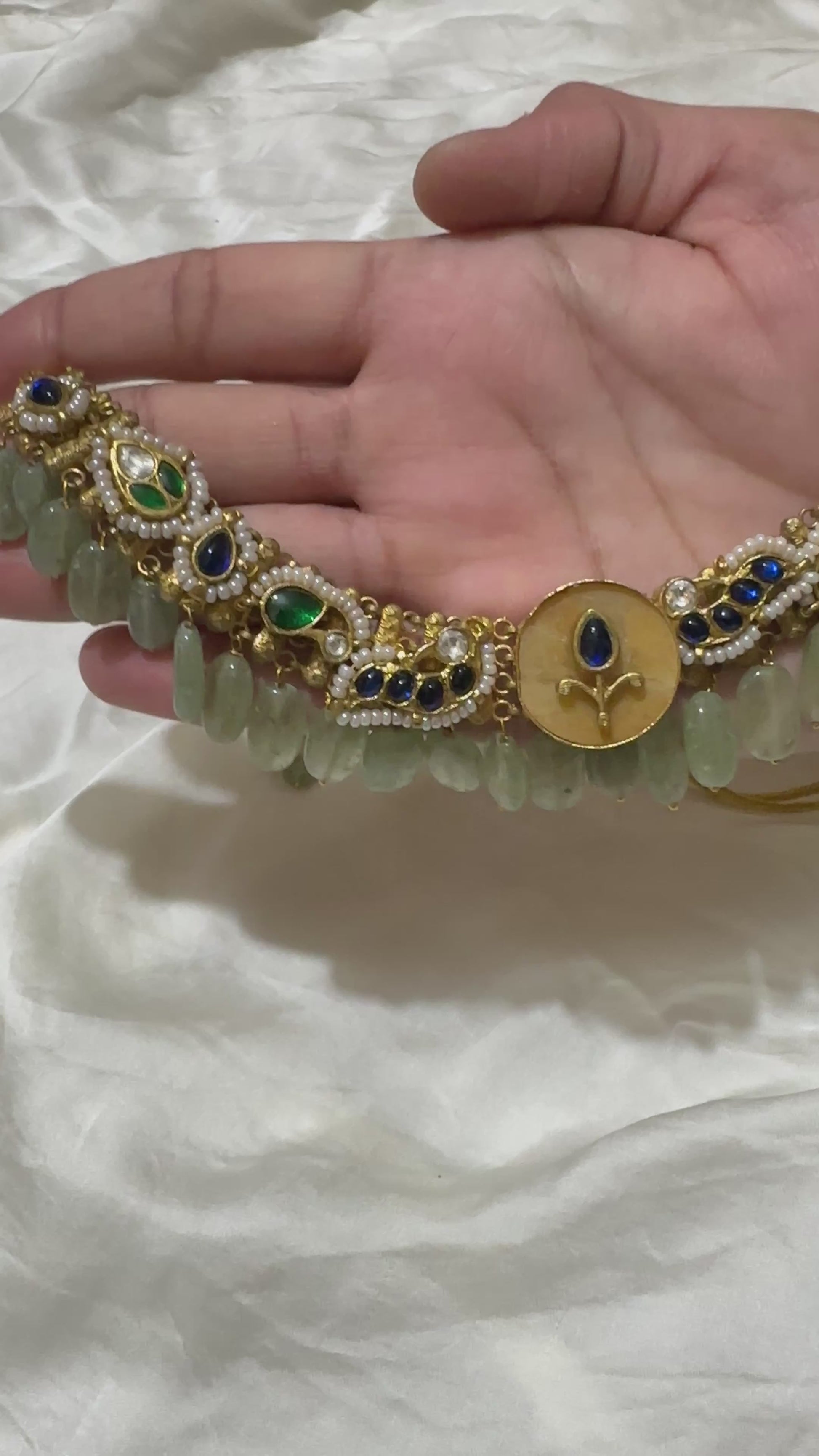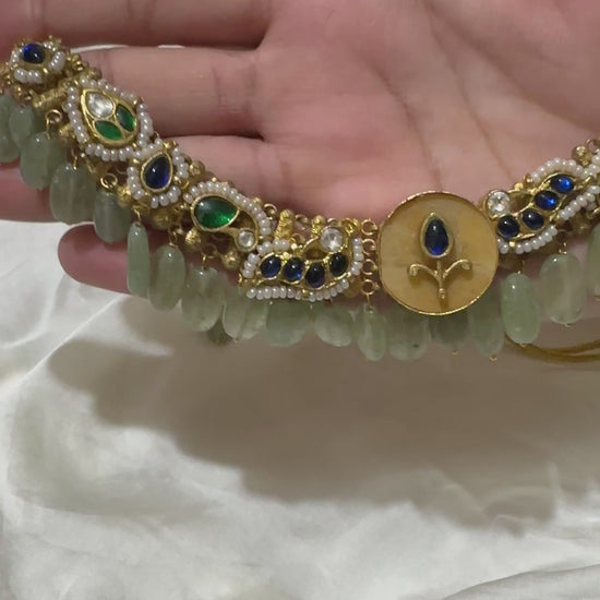 * Adorned with Kundan-style stones in deep blue and emerald-green hues.