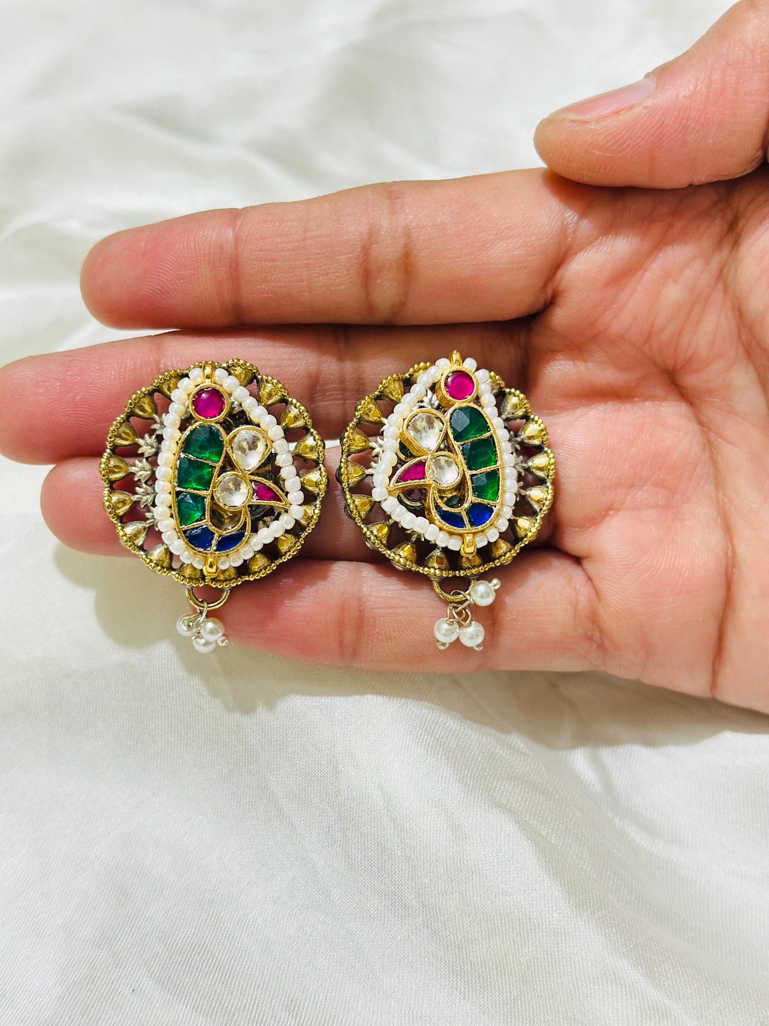 * Features an intricate peacock motif set with vibrant, multi-hued Kundan-style stones.